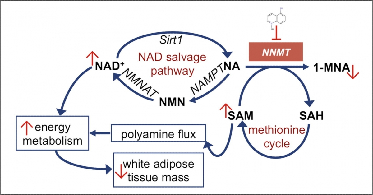В самом общем виде повышенная активность NNMT может уводить никотинамид от NAD+-связанного обмена в сторону образования 1-MNA. Поэтому ингибирование NNMT рассматривается как способ уменьшить липогенез и улучшить некоторые метаболические показатели в доклинических моделях.
