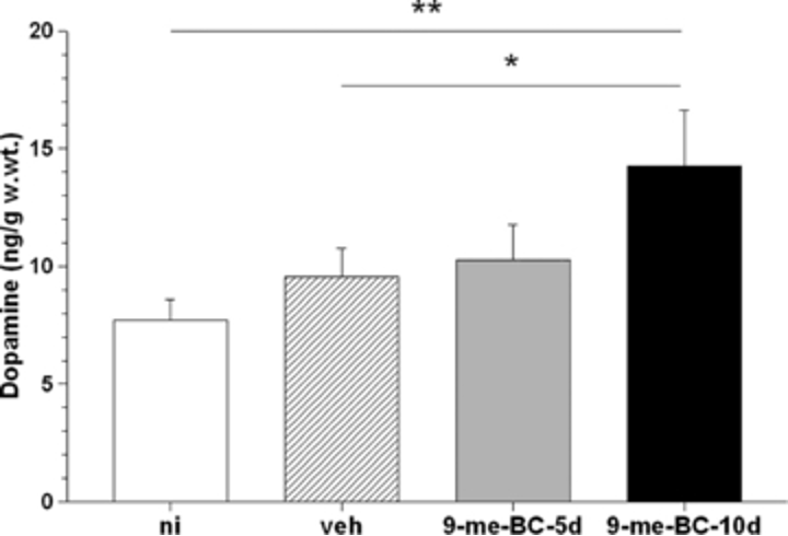 Ткань гиппокампа крыс была дополнительно исследована с целью измерения изменений в уровнях дофамина гиппокампа и пролиферации синапсов и дендритов. Опять же, не было никакой разницы в уровнях дофамина гиппокампа у крыс, которым вводили 9-Me-BC в течение 5 дней, и у тех, кому давали растворитель. Однако у крыс, которым давали 9-Me-BC в течение 10 дней, наблюдалось значительное увеличение уровней дофамина гиппокампа, почти вдвое превышающее уровни у животных без инъекций.