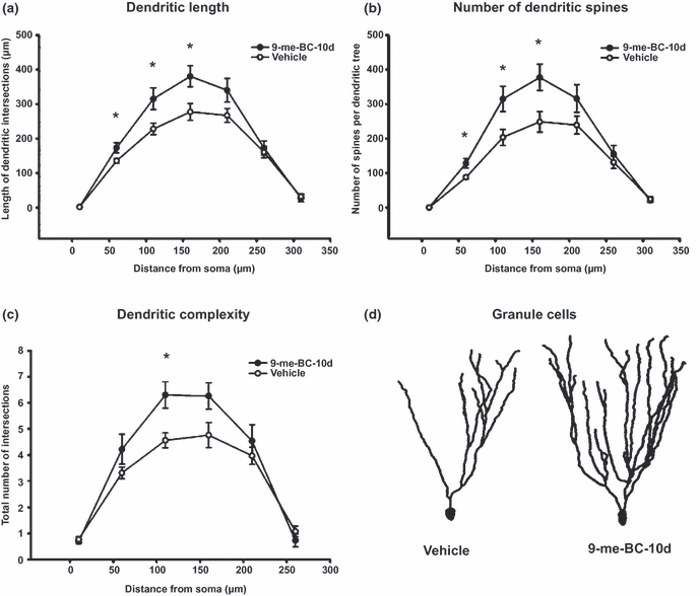 Важно отметить, что при наблюдении за синаптической и дендритной пролиферацией сравнивались только данные крыс, которым вводили растворитель, и тех, кто получал 9-Me-BC в течение 10 дней. При этом был обнаружен резкий рост в синапсах и дендритах крыс, получавших 9-Me-BC. Наиболее значимые изменения наблюдались при 60 мкм, 110 мкм и 160 мкм [2].