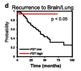 Вероятность рецидива рака молочной железы в мозге или легких в условиях низкого и высокого уровня фоллистатина (FST)