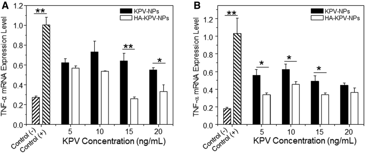 Дальнейшие исследования механизмов доставки KPV показали, что загрузка KPV на наночастицы, функционализированные гиалуроновой кислотой, помогает направить воспалительные эффекты пептида в нужные места в кишечнике. Это приводит к ускоренному заживлению слизистой оболочки и облегчению воспаления посредством сильной понижающей регуляции TNF-альфа в мышиных моделях[3]. Во многих отношениях KPV является более эффективным и более целенаправленным средством уменьшения воспаления при ВЗК, не влияя на TNF-альфа в других местах организма. Преимущество модификации KPV заключается в улучшении пероральной биодоступности пептида. Это не увеличивает эффективность пептида, но влияет на его активность и, таким образом, общую дозу, необходимую для достижения эффекта.