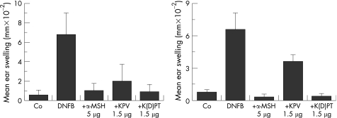 График показывает отек уха из-за контактного дерматита через 24 часа (слева) и 2 недели (справа). Обратите внимание, что совместное введение KPV с раздражителем почти так же эффективно, как совместное введение альфа-MSH с раздражителем через 24 часа. Однако через 2 недели воздействие стимула без совместного введения пептидов показывает гораздо меньший отек с альфа-MSH по сравнению с KPV.