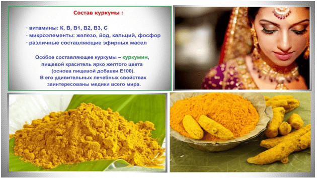 Главным действующим агентом популярной приправы является уникальный полифенол или по-другому куркумин, который не содержится ни в одном другом растении. Он обусловливает насыщенный желтый цвет, горьковатый вкус и характерный пряный аромат. Помимо куркумина, мясистый корень растения добывают, потому что в нем содержатся и другие ценные элементы: