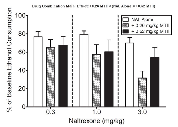 В соответствии с идеей о том, что MT-2 может влиять на сигнализацию окситоцина и, таким образом, на поведение при РАС, исследования также показывают, что рецептор MC-4R может играть роль в контроле импульсов. Прошлые исследования на крысах показали, что введение MT-2 снижает потребление алкоголя и увеличивает потребление воды даже у крыс, которые предпочитают алкоголь [8]. Совсем недавно исследования показали, что меланотан-2 действует синергически (повышая эффективность более чем в семь раз) с налтрексоном, притупляя тягу к этанолу у мышей [9].