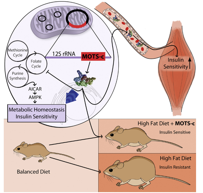 Данные, полученные на мышах, показывают, что MOTS-c, особенно в условиях ожирения, является важным регулятором метаболизма сфинголипидов, моноацилглицеринов и дикарбоксилатов. Понижая регуляцию этих путей и увеличивая бета-окисление, MOTS-c, по-видимому, предотвращает накопление жира [4]. Некоторые из этих эффектов почти наверняка опосредованы действием MOTS-c в ядре. Исследования MOTS-c привели к новой гипотезе об отложении жира и резистентности к инсулину, которая набирает популярность в научном сообществе и может предложить новые способы вмешательства в патофизиологию ожирения и диабета. Похоже, что нарушение регуляции метаболизма жиров в митохондриях может привести к отсутствию окисления жиров. Это приводит к более высоким уровням циркулирующего жира и, таким образом, заставляет организм повышать уровень инсулина в попытке очистить кровоток от липидов. Следствием этого действия является повышенное отложение жира и гомеостатическое изменение в организме, поскольку он адаптируется к хронически более высоким уровням инсулина (и становится устойчивым к ним) [5].