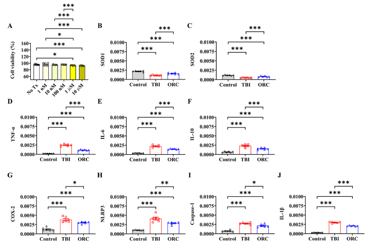 Рисунок 1: Изменения в (A) жизнеспособности клеток, (B) SOD1, (C) SOD2, (D) TNF-альфа, (E) IL-6, (F) IL-10, (G) COX-2, (H) NLRP3, (I) Caspase-1 и (J) IL-1 бета