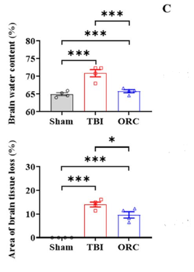 Для части исследования in vivo испытуемые были разделены на 3 группы по 20 мышей, каждая из которых представляла собой контрольную группу, перенесшую ложную операцию, группу, у которой была вызвана ЧМТ, и экспериментальную группу, у которой была вызвана ЧМТ и которую лечили оксирацетамом. У мышей было получено несколько образцов, и были выполнены процедуры для оценки эффектов ноотропа на РНК и белок, окрашивание IF, BWC и окрашивание TTC. Результаты, полученные из этих образцов и дополнительной визуализации, показали, что травмированный мозг испытал значительную потерю кортикальных тканей после индукции ЧМТ. Однако у испытуемых, лечившихся оксирактамом, наблюдалось заметное снижение объема кортикальной ткани, потерянной после ЧМТ.