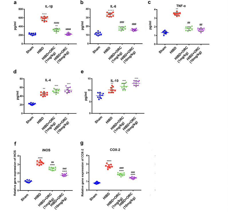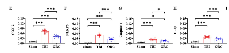 Рисунок 2: Изменения в (C) содержании воды в мозге и площади потери мозговой ткани, (E) COX-2, (F) NLRP3, (G) Caspase-1 (H) IL-1 beta