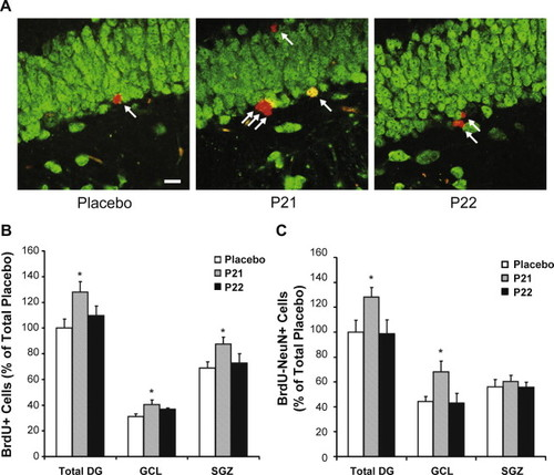 Исследования на мышах показывают, что P21 увеличивает уровни BrdU-положительных клеток в зубчатой извилине. BrdU – это синтетический нуклеозид (аналог тимидина), используемый для обнаружения пролиферирующих клеток в живых тканях. В этом эксперименте он был обнаружен сконцентрированным в зубчатой извилине мышей, которым вводили P21, но не в DG контрольных мышей, что позволяет предположить, что P21 способствует пролиферации клеток в этой области. Чтобы определить, являются ли клетки нейронами или нет, можно измерить экспрессию NeuN, поскольку это маркер зрелых нейронов. Она также значительно увеличивается у мышей, которым вводили P21, и в области увеличения BrdU, что подтверждает идею о том, что повышенная пролиферация на самом деле является повышенным нейрогенезом[3].