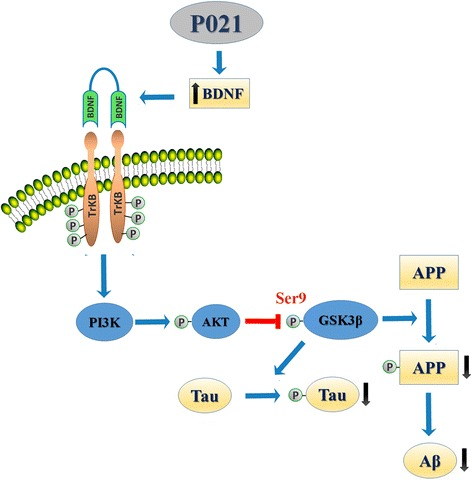 Схема TA P21 (P021) при патологии болезни Альцгеймера. Обратите внимание, что увеличение BDNF приводит к заметному снижению фосфорилирования тау, а также к снижению развития амилоидных бляшек. Это происходит посредством активации P13K и, таким образом, подавления GSK-3beta. Последняя стала молекулой, представляющей интерес при болезни Альцгеймера, поскольку считается, что она напрямую влияет на накопление бляшек в мозге.