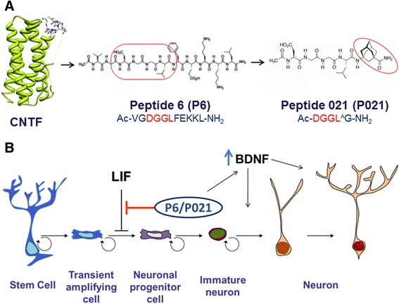 Роль P21 (и аналогичного P6) в содействии нейрогенезу. Обратите внимание на ингибирующий эффект на LIF и стимулирующий эффект на BDNF.