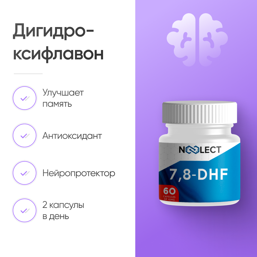 Флавоноид был открыт в процессе поиска веществ, способных имитировать воздействие нейротрофического фактора мозга (BDNF). Его основное свойство - ускорение роста нейронов и синапсов. Клинические исследования показали, что 7,8-DHF облегчает симптомы таких заболеваний, как Альцгеймер, Паркинсон и шизофрения. Он также уменьшает образование амилоидных бляшек и окислительный стресс, что способствует профилактике деменции у пожилых людей.