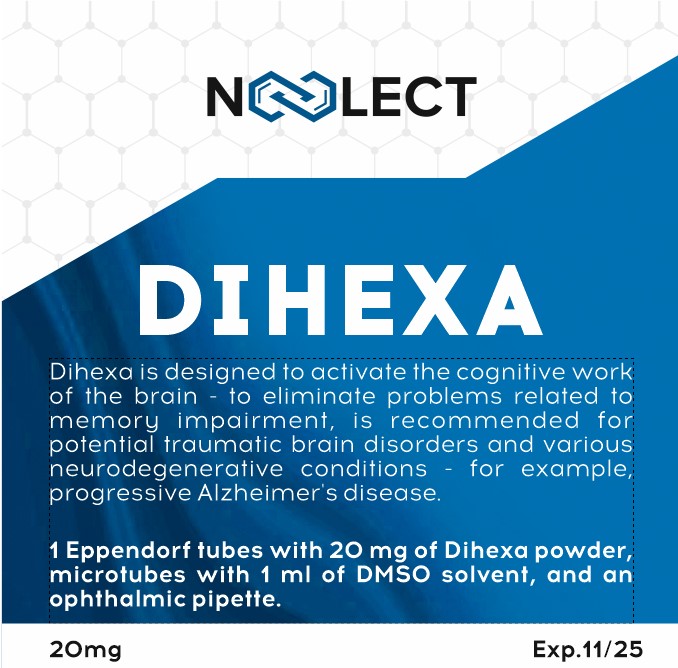 Dihexa - это усовершенствованный ноотропный пептид, который способствует сужению сосудов и увеличению артериального давления. Его главное активное вещество - ангиотензин IV. На рынке представлен в форме пластиковой пробирки с порошком для раствора. Иногда в комплект входят микропробирка Эппендорфа с 20 мг порошка, растворитель DMSO и пипетка для офтальмологического применения.