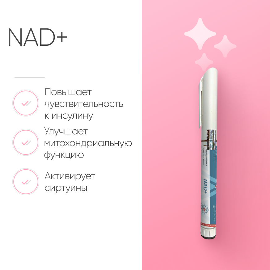Инъекционный NAD+ улучшает митохондриальное дыхание и выработку АТФ, активирует сиртуины, которые регулируют процессы старения и регенерации клеток. Поддерживает здоровье мозга, улучшает нейропластичность и когнитивные функции, снижает окислительный стресс и защищает клетки от повреждений. Также улучшает чувствительность к инсулину, что важно для профилактики диабета 2 типа.