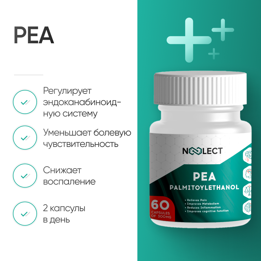 Среди других преимуществ PEA - поддержка при нейродегенеративных заболеваниях, восстановление после инсульта, снижение риска болезни Паркинсона, а также поддержка здоровья глаз и помощь при депрессии. PEA может снизить риск ретинопатии и улучшить зрение при курсовом применении в течение полугода.