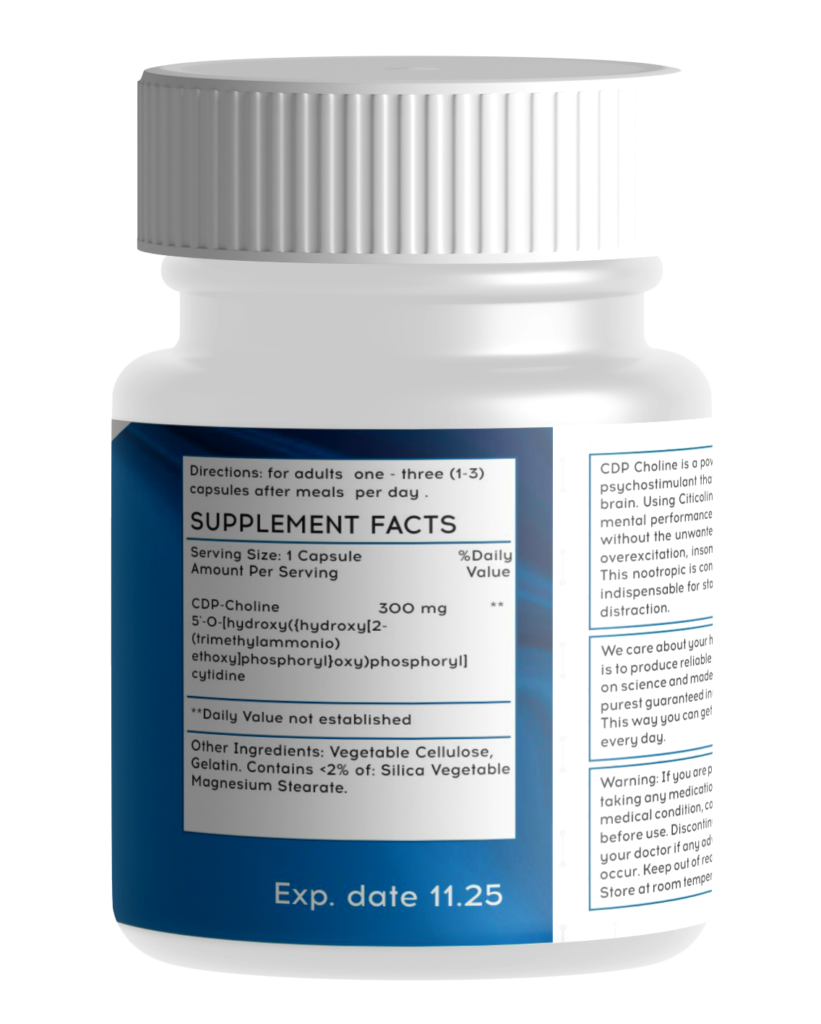 Цитиколин CDP Choline - это эффективная ноотропная и психостимулирующая добавка, которая естественным образом образуется в мозге. Она способствует улучшению умственной активности, памяти и концентрации, а также помогает при усталости и сниженной внимательности. Каждая капсула содержит 300 мг активного вещества.