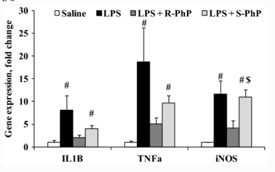 При изучении противовоспалительных эффектов соединения оценивалась и регистрировалась температура тела во всех группах до и после инъекции ЛПС, вызывающей воспаление. До инъекции температура тела была одинаковой во всех группах, однако через 6 часов после инъекции температура тела экспериментальных групп значительно снизилась по сравнению с температурой субъектов, включенных в контрольную группу. Инъекция ЛПС также была связана со значительным увеличением экспрессии воспалительных генов, таких как ИЛ-1 бета, ФНО-альфа и iNOS, на 75%, 73% и 65% соответственно. Экспрессия воспалительных генов в экспериментальной группе, которой вводили R-фенилпирацетам, существенно не отличалась от экспрессии в контрольной группе. Исследователи посчитали важным отметить, что предварительная обработка S-фенилпирацетамом привела к небольшому снижению экспрессии ИЛ-1 бета и ФНО-альфа по сравнению с экспрессией в контрольной группе ЛПС. Однако экспериментальная группа, получавшая S-фенилпирацетам, имела значительно более высокие уровни экспрессии воспалительных генов, чем испытуемые, получавшие физиологический раствор. Также не было заметной разницы в экспрессии гена iNOS, вызванной ЛПС, у испытуемых, получавших R-фенилпирацетам по сравнению с S-фенилпирацетамом [3].