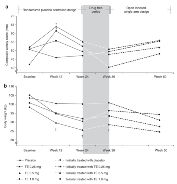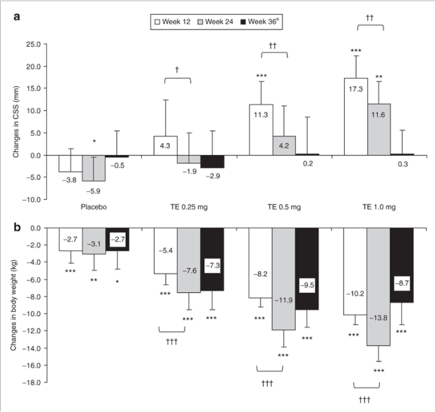 В течение всего проекта средняя потеря веса тела составила 12,8 +/- 8,9 кг, независимо от первоначального лечения, которому подвергался субъект. Однако важно отметить, что индивидуальное изменение веса после 60 недель положительно коррелировало с изменением веса, которое испытывали субъекты в течение первой части проекта. Аналогично, изменение CSS от исходного уровня не зависело от лечения, которое каждый субъект получал в первой части исследования. Исследовательская группа также сообщила о значительной потере веса в группах, получавших дозы 0,5 и 1,0 мг тезофензина (12,0 +/- 6,3 кг и 13,8 +/- 5,5 кг соответственно). Группы, получавшие эти дозы, затем были объединены в качестве начальной процедуры последующего анализа. В конце исследования обе группы лечения показали схожее изменение CSS по сравнению с исходными значениями. Было показано, что CSS увеличился в обеих группах лечения во второй части исследования; объединенная группа увеличилась на 6,2 +/- 18,2 мм, тогда как меньшие группы плацебо увеличились на 6,1 +/- 17,8 мм [1].
