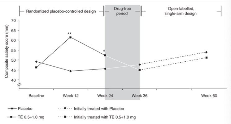 1) Исследователи определили, что с 12-й по 24-ю неделю лечения тезофензином потеря веса была обусловлена в основном усилением чувства сытости и снижением аппетита.