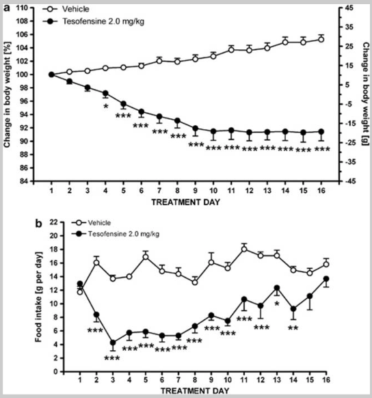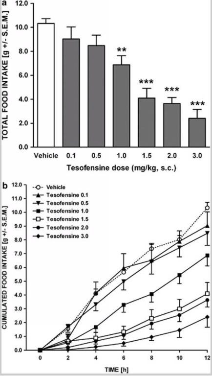 2) Исследовательская группа Акселя и др. сообщила, что тезофензин способен вызывать гипофагию у крыс с DIO. При подкожной инъекции дозы пептида, варьирующейся от 0,1 до 3 мг/кг, у испытуемых наблюдалось угнетение потребления пищи в течение 12-часового ночного периода наблюдения. Было показано, что угнетение общего потребления пищи достигает порогового значения при дозах 1,0 мг/кг. За 12-часовой период наблюдения крысы, которым вводили растворитель, потребляли приблизительно 54,1 +/- 2,1 ккал пищи; потребление пищи крысами, которым вводили дозу тезофензина 3,0 мг/кг, снизилось на 77% до приблизительно 12,6 +/- 3,9 ккал. При анализе временных эффектов тезофензина результаты показали, что дозы пептида, превышающие 0,5 мг/кг, имели тенденцию к значительному влиянию на совокупное потребление пищи.