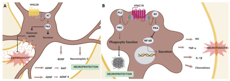 Эффекты VIP в защите ЦНС, по-видимому, опосредованы рецепторами VPAC1 и VPAC2. В обоих случаях стимуляция, по-видимому, приводит к увеличению секреции нейротрофических факторов, таких как ADNP (нейротрофический фактор, зависящий от активности) и BDNF (нейротрофический фактор, происходящий из мозга). Оба этих пептида помогают защищать синапсы и астроциты.